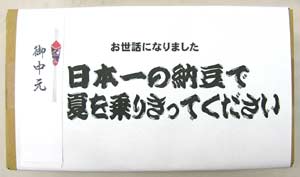 お中元ギフト梱包天然わら納豆「大天元」1本天然わら納豆(大)300g1本&2倍おいしい醤油1本 価格: 5,500円 レビュー評価:3.0 レビュー数:1 只今お中元の予約受付中!! 天然わら納豆「大天元」300g1本と天然わら納豆(大)300g1本2倍おいしい醤油500ml 1本のセットです。こんにちは!有機家店長のクマクマです。この天然わら納豆を受け取ったお方は先ず・・・・・・・・・・「なんだ?これは??納豆か??」と全長約46センチのその巨大さにビックリすることでしょう(^^ゞそして・・・・・・・「おーい おかあさん ちょっと見てみなさい」ご夫婦ともども大笑い・・なさるかもしれません。とにかく召し上がる前に先ずビックリ・・そして「夏を乗り切ってください」・・か夏の食欲のないときには納豆はピッタリだな?気使いがうれしいね・・と喜んでいただける Supported by 楽天ウェブサービス |